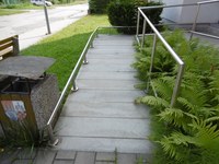 Hlavní vstup z ulice Moravská na vyvýšenou zastřešenou předloženou podestou je řešen 5 schody a trojramennou zalomenou rampou (1 úsek sklon 7,5% až 9%, průjezdná šíře 113 cm, délka 297 cm; podesta průjezdná šíře 130 cm, délka 170 cm; 2 úsek sklon 9%, průjezdná šíře jedna část 145 cm, délka 121 cm; podesta průjezdná šíře 130 cm, délka 150 cm; 3 úsek sklon 8,5%, průjezdná šíře jedna část 121 cm, délka 495 cm) Rampa je opatřena jednostranným madlem (výška 92 cm) i zábranou proti přepadu. Povrch rampy tvoří kamenné desky. Manipulační prostor nad i pod rampou je dostatečný.