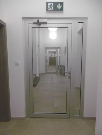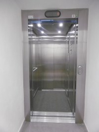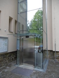 Výtah má před venkovním vstupem dostatečný manipulační prostor. Výtah je průchozí, druhé dveře jsou umístěny na čelní stěně a spojuje 1. PP až 3. NP (0, 1, 2, 3). Šachetní i klecové dveře se otevírají automaticky do stran (průjezdná šířka 90 cm) a uvnitř budovy jsou umístěny v nice-výklenku (šířka 120 cm, hloubka 52 cm). Ve výtahové kleci (šířka 110 cm, hloubka 140 cm) je na boční stěně umístěno madlo (výška 92 cm, odsazení madla od stěny 8,5 cm) a zrcadlo (výška 95 cm). Výška ovladače v nástupních místech je 110 cm, výška horního tlačítka uvnitř klece je 105 cm.