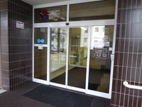 - V přízemí za hlavním vstupem je hala, ve které se nachází informace s okénkem ve výši 100 cm, informační panel - výše horního tlačítka 120 cm, dveře na poštu šíře 90 cm, přístupný výtah a dvoukřídlé dveře vedoucí do chodby, opatřené zavíracím mechanizmem (Brano), průjezdná šíře jednoho křídla 79 cm. Podatelna: průjezdná šířka dveří 89, vysoký práh z chodby (6 cm), nízký práh z podatelny (1,5 cm). V chodbě je převýšení výše 2 cm, řešeno šikmou hliníkovou lištou.