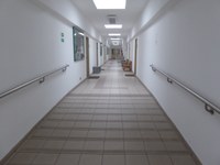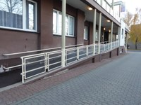 - Dveře z haly od výtahu k vstupu ke kancelářím - dvoukřídlé 87,5 cm / 85 cm (šíře celkového průjezdu po otevření 171 cm, mechanicky otvíratelné křídlo - průjezdná šíře 82,5 cm, práh není. Kancelář šíře dveří 80 cm, nízký práh (2 cm). Na chodbě je převýšení řešené nájezdovou rampou sklon 6,2%, délka 406 cm, průjezdná šířka 220 cm. Rampa je opatřena oboustranným madlem ve výši 90 cm. Povrch rampy tvoří nekluzná keramická dlažba. Manipulační prostor nad i pod rampou je dostatečný.