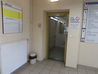 - Výtah samoobslužný s vyhovujícími parametry se nachází naproti hlavního vstupu (automaticky otevíratelné dveře šířka 80 cm, klec šířka 110 cm, hloubka 210 cm), je vybaven madlem (výška 99 cm), zrcadlem naproti dveřím a sklopným sedátkem. Ovladač na nástupních místech je ve výšce max. 116 cm, maximální výška ovladačů uvnitř klece je 123 cm. Výtah spojuje suterén, přízemí až 3. patro. Manipulační prostor před výtahem je dostatečný.