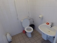 - Integrováno do dámských toalet (dveře šířka 80 cm šířka 158 cm hloubka 173 cm). Přístup k míse z pohledu od vstupu do kabiny je zleva, výška záchodového prkénka (42 cm). Mísa WC je opatřena sklopnými madly (délka 83 cm, výška 84 cm, osová vzdálenost 60 cm). Kabina je vybavena umyvadlem a je zde k dispozici nadstavec na WC. Přístup přes společnou předsíň (dveře otevíratelné dovnitř šířka 80 cm, šířka 187 cm, hloubka 330 cm, tři umývadla) Na dveřích předsíně i kabiny chybí madla. WC označeno piktogramem ženy i vozíku a je uzamčeno (klíč v podatelně).