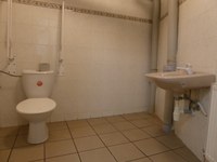 - Integrováno do dámských toalet (dveře šířka 80 cm šířka 159 cm hloubka 175 cm, na dveřích instalováno vně i vevnitř krátké madlo ve výšce 83 cm). Přístup k míse z pohledu od vstupu do kabiny je zleva, výška záchodového prkénka (41,5 cm). Mísa WC je opatřena sklopnými madly (délka 81 cm, výška 82 cm, osová vzdálenost 57,5 cm). Kabina je vybavena umyvadlem a je zde k dispozici nadstavec na WC. Přístup přes společnou předsíň (dveře otevíratelné dovnitř šířka 80 cm, šířka 180 cm, hloubka 335 cm, kuchyňská linka a umývadlo) Na dveřích předsíně chybí madlo. WC označeno piktogramem ženy i vozíku a je uzamčeno (klíč na sekretariátě).