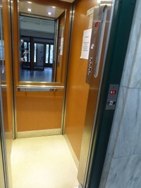 Výtah menších rozměrů spojuje Přízemí až 3. patro (mechanicky otevíratelné jednokřídlé dveře šířka 70 cm, klecové dveře automaticky otevíratelné do stran - systém tzv. BUS, klec šířka 80 cm, hloubka 105 cm) je vybaven madlem (výška 90 cm) a zrcadlem. Ovladač na nástupních místech je ve výšce max. 108 cm, maximální výška ovladačů uvnitř klece je 136 cm. Manipulační prostor před výtahem je dostatečný.