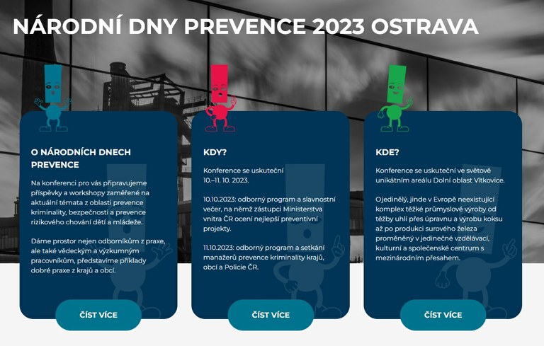 Největší akce v oblasti prevence kriminality Národní dny prevence se budou letos konat v Ostravě ve dnech 10. a 11. října. Statutární město Ostrava pořádá čtvrtý ročník odborné konference Národní dny prevence, jejímž cílem je výměna zkušeností a sdílení dobré praxe v oblasti prevence kriminality a bezpečnosti na národní, regionální a místní úrovni.