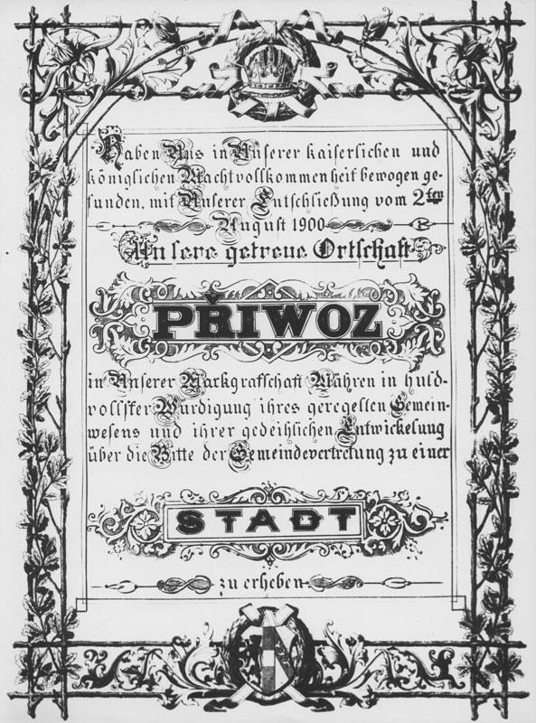 Na fotografii je zobrazena listina, kterou byl Přívoz v roce 1900 povýšen na město.