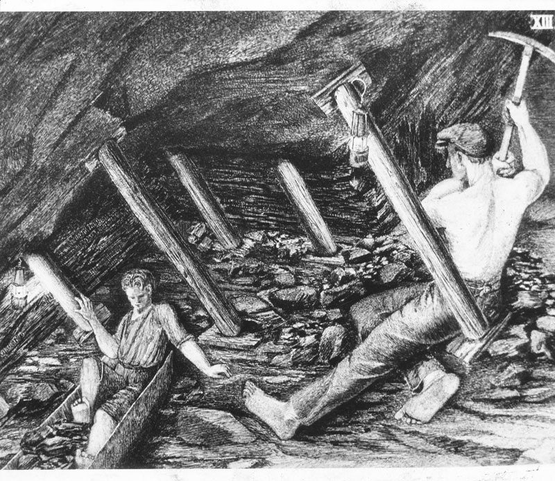 Kresba: Ruční dobývání uhlí na Ostravsku ve druhé polovině 19. století.