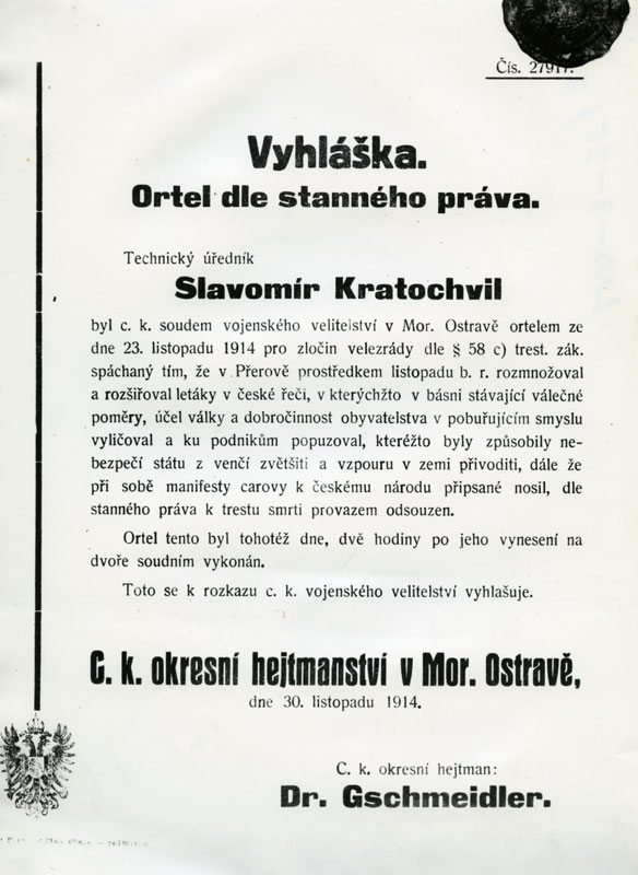 Dne 25. 11. 1914 vynesl stanný soud v Moravské Ostravě rozsudek smrti nad pětadvacetiletým technickým úředníkem z Přerova Slavomírem Kratochvílem za rozmnožování a rozšiřování ilegálních letáků. Trest byl na dvoře moravskoostravského okresního soudu ihned vykonán. Tato první oběť rakouské vojenské justice vzbudila velké rozhořčení mezi českým lidem, dozvěděli se o ní také příslušníci zahraničního odboje. Pozdější prezident T. G. Masaryk o tom napsal: „Odsouzení Kratochvílovo bylo mi důkazem, že Vídeň nadobro trhá svazky s námi a povoluje úplně násilnické politice militaristického pangermanismu. Proto smrt Kratochvílova stala se mně jedním z hlavních důvodů pro mé definitivní protirakouské rozhodnutí.“