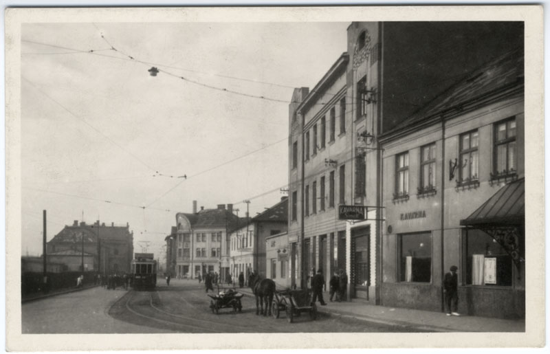 K foto: Svinov ve 20. letech minulého století. Pohled na dnešní Peterkovu ulici, za tramvají vlevo je budova železničního nádraží.
