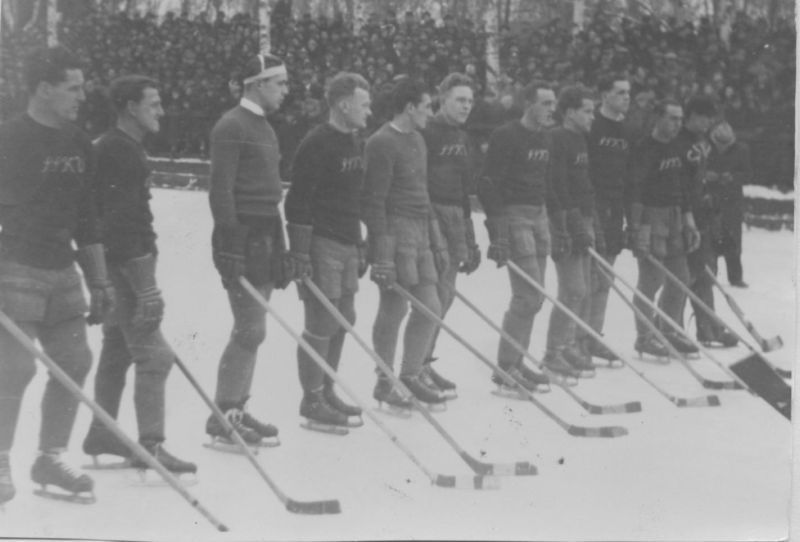 Popisek k foto: Hokejisté SSK Vítkovice před zaplněnými tribunami na kluzišti u Sportovního pavilonu ve Vítkovicích.