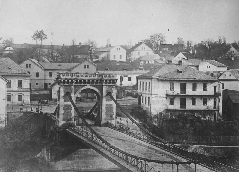 1. Řetězový most přes Ostravici, spojující v letech 1851 – 1886 Moravskou a Slezskou Ostravu (pohled z moravskoostravské strany).