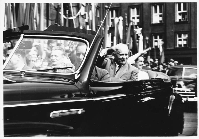 Nikita Chruščov zdraví občany Ostravy před Novou radnicí. Vlevo od něho je Antonín Novotný, první tajemník ÚV KSČ a pozdější prezident ČSR (13. 7. 1957).