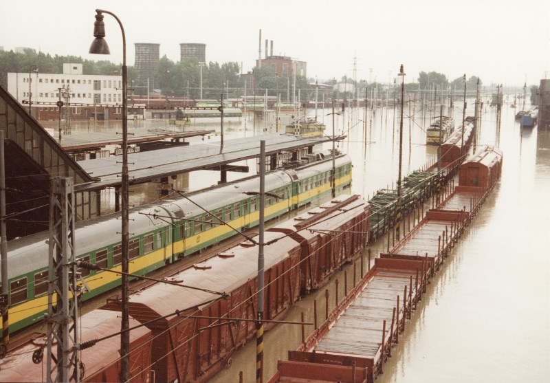 Zatopené hlavní nádraží v Ostravě-Přívoze při povodni v roce 1997.