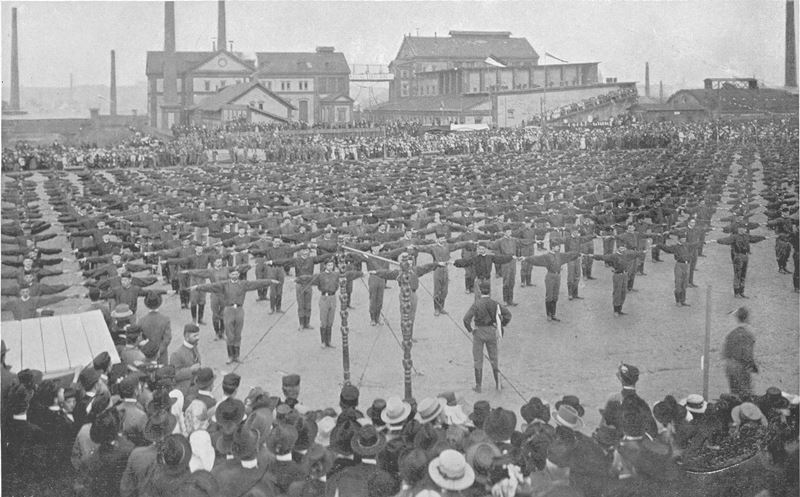 Sokolské cvičení na sletišti u Českého akciového pivovaru v Moravské Ostravě v roce 1902.