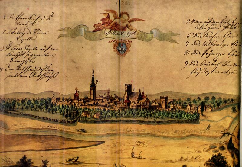 Věž staré radnice v Moravské Ostravě na vedutě (pohled, výtvarné vyjádření pohledu na město) z roku 1728.