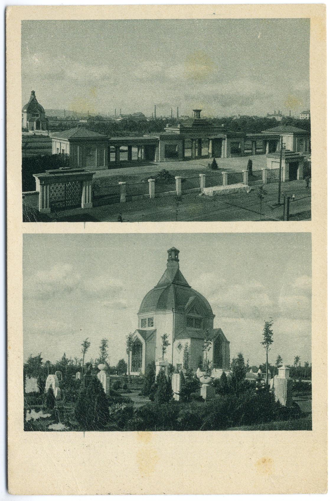 Pohlednice s krematoriem a moravskoostravským hřbitovem při ulici 28. října (dnes sad Milady Horákové). Krematorium bylo zbouráno v roce 1979.