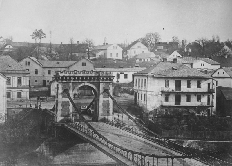 Řetězový most přes řeku Ostravici s pohledem na Polskou (dnes Slezskou) Ostravu (kolem roku 1885).