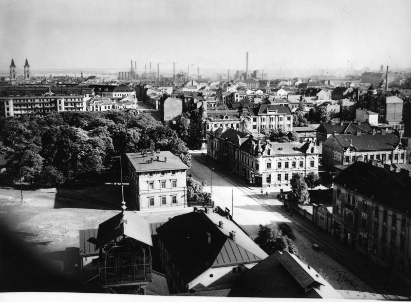 Areál „Hanke“ v Nádražní ulici byl v pravé spodní části snímku – dům s oploceným nádvořím a stromy. Vlevo dole je těžní věž Dolu Jindřich (foto z let 1918–1938).