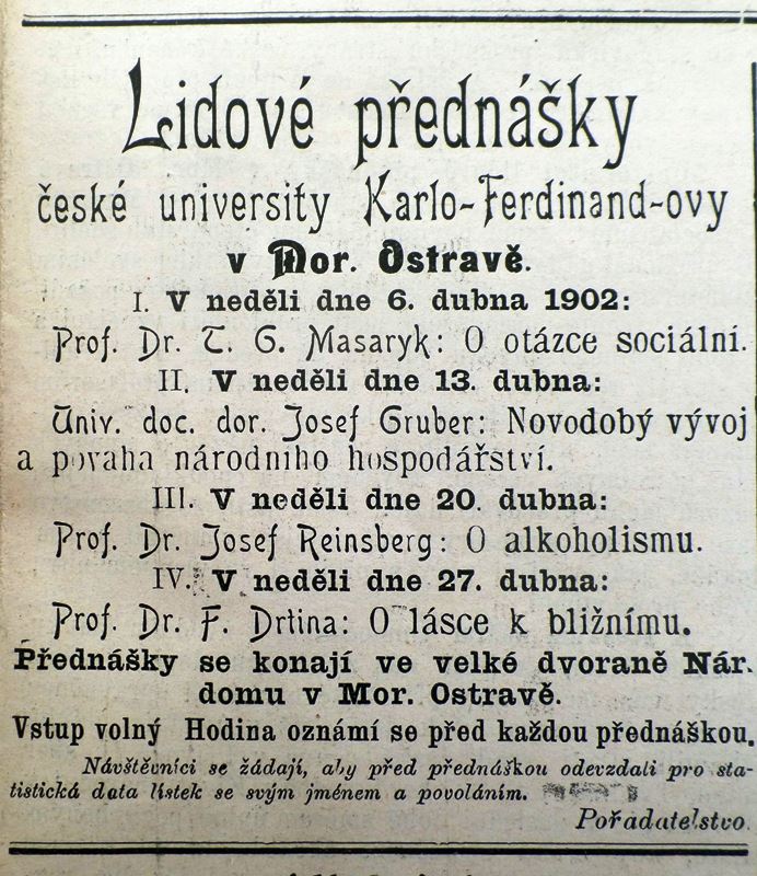 V neděli dne 6. 4. 1902 přednášel v Národním domě v Moravské Ostravě prof. T. G. Masaryk v rámci vzdělávacího cyklu lidových přednášek, pořádaných c. k. českou univerzitou Karlo-Ferdinandovou, na téma „O otázce sociální“.