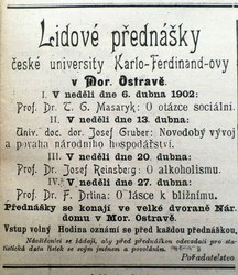 Oznámení o konání přednášek T. G. Masaryka a dalších osobností v Národním domě v Moravské Ostravě v dubnu 1902.