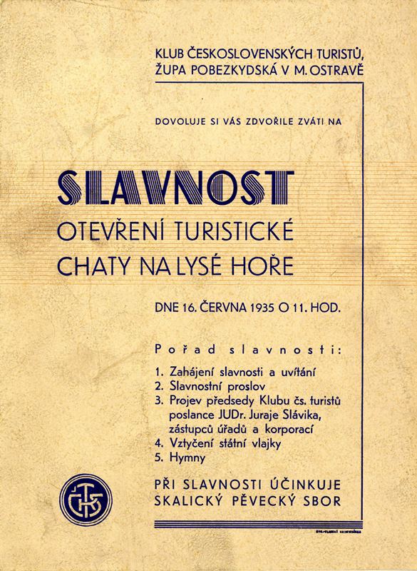 Pozvánka na slavnost otevření Bezručovy chaty na Lysé hoře (1935).