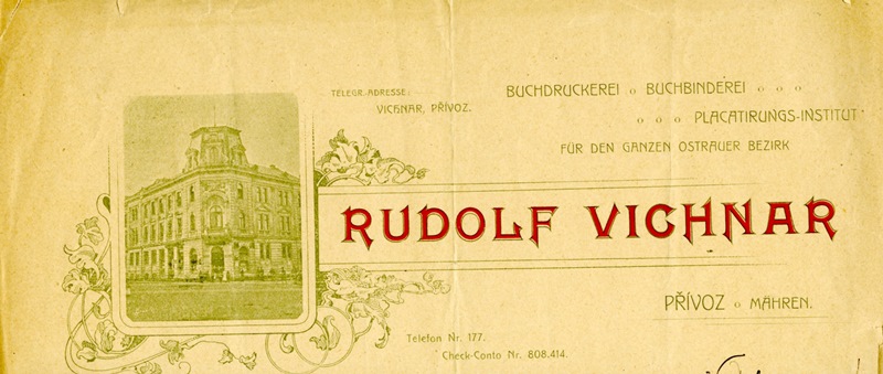 Firemní záhlaví přívozské tiskárny R. Vichnara (počátek 20. století).
