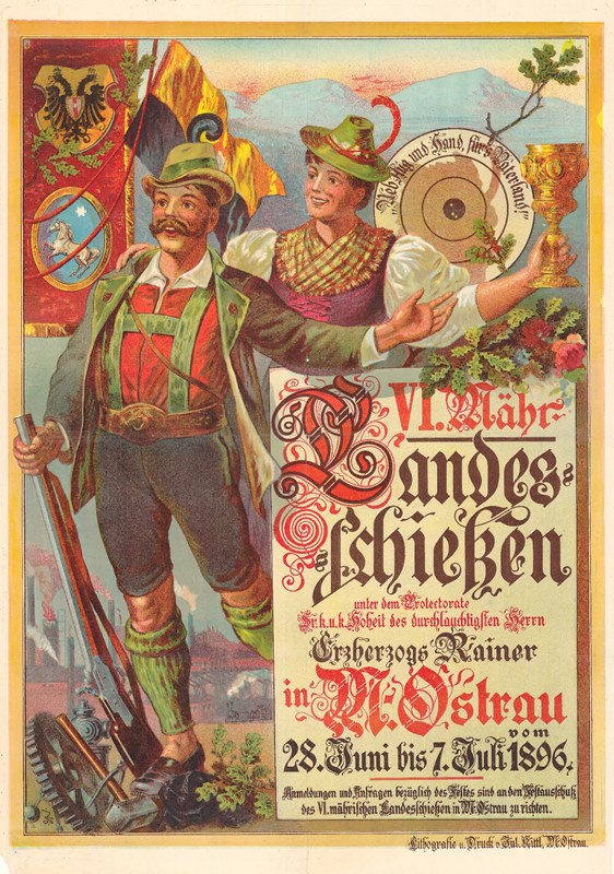 Plakát zvoucí na střeleckou slavnost v Moravské Ostravě (1896).