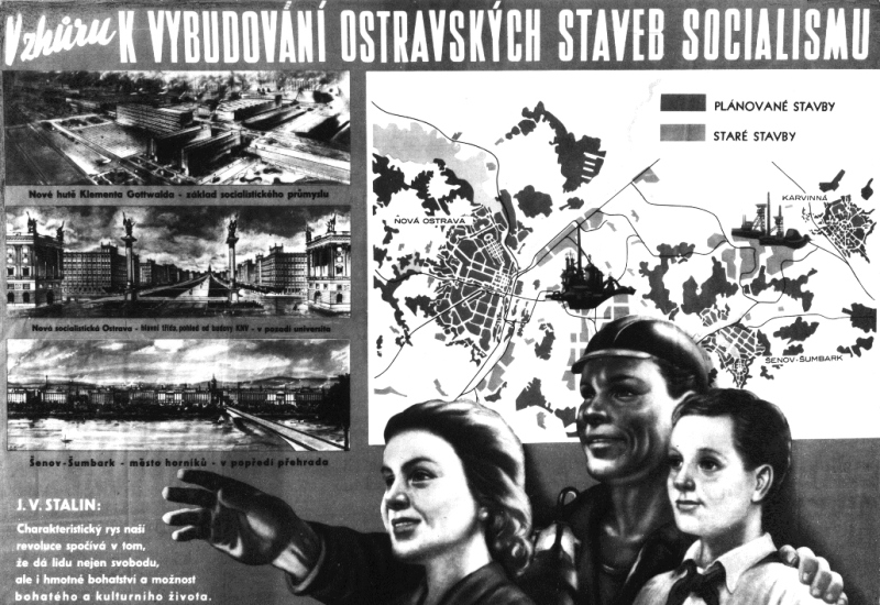 Plakát k plánovaným „stavbám socialismu“ na Ostravsku s citátem J. V. Stalina (1951).
