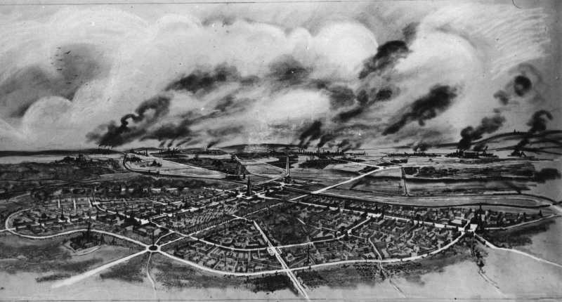 V. Meduna, M. Čtvrtníček, R. Spáčil, Stavoprojekt, středisko Ostrava, Nová Ostrava, kresba leteckého pohledu na plánované nové město, v pozadí stará průmyslová Ostrava (1951).