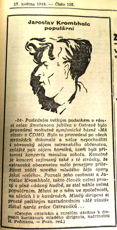 Zpráva v novinách České slovo o provedení cyklu symfonických básní B. Smetany Má vlast orchestrem řízeným J. Krombholcem v Moravské Ostravě v květnu 1944.