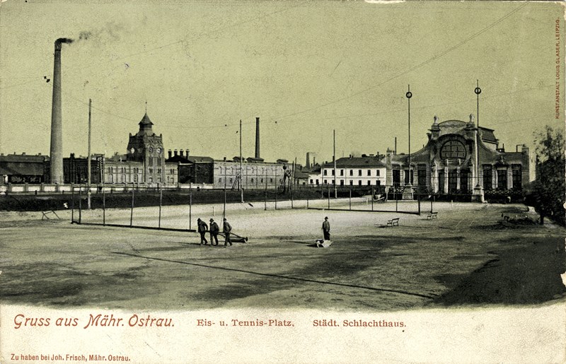 Kluziště u jatek sloužilo v létě rovněž jako tenisový kurt (stav před rokem 1918).