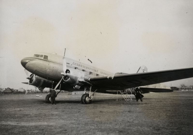 Letoun Čs. aerolinií Douglas DC-3, zvaný Dakota, na letišti v Ostravě-Hrabůvce na konci 40. let 20. století. Na podobném stroji s registračním označením OK-WDR přeletěli bývalí piloti RAF tzv. železnou oponu.