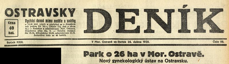 Novinový titulek, Ostravský deník z 26. 4. 1928.
