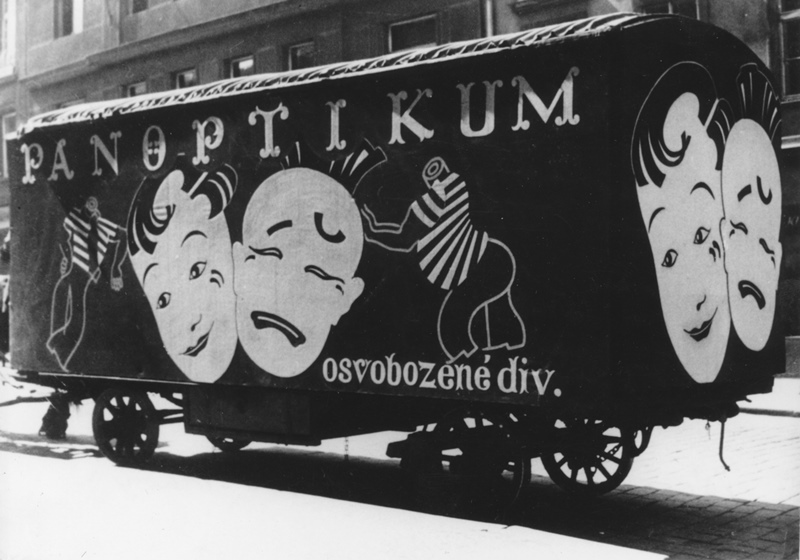 Vůz divadla V+W v ulicích Ostravy, pravděpodobně v roce 1935.