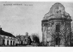 Kostel sv. Josefa bez věže, přízemní domek vlevo je kaple a márnice. Slezská Ostrava, počátek 20. století.