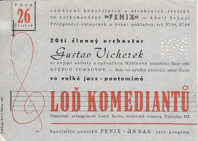 Reklama na zahájení koncertních čtvrtků orchestru Gustava Vicherka v kavárně Fénix v Moravské Ostravě ze dne 26. 2. 1942.
