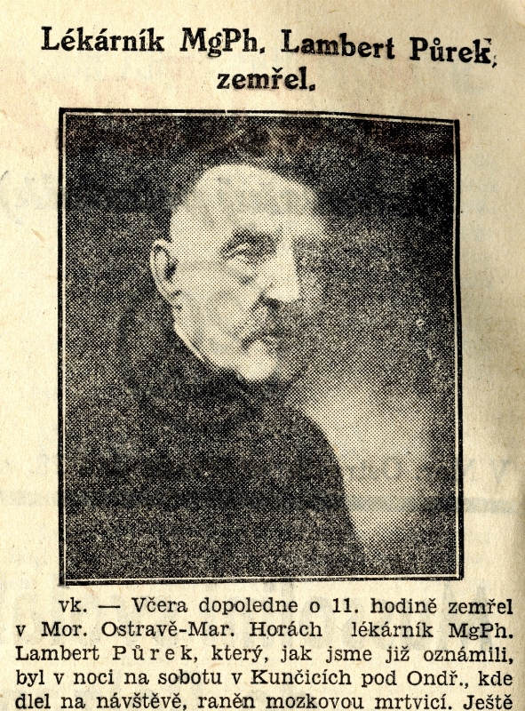 Dne 27. 8. 1935 zemřel v Ostravě – Mariánských Horách PhMr. Lambert Půrek, lékárník a český národní pracovník. Narodil se 22. 3. 1863 v Kyjově (okr. Hodonín), kde navštěvoval gymnázium, později vystudoval ve Vídni farmacii. Od roku 1903 žil v Mariánských Horách. S manželkou Albertou (nar. 1878) měl tři děti (Karla nar. 1905, Lubomíru nar. 1907 a Alexandra nar. 1908). Byl zakládajícím členem a starostou Sokola, předsedou Národní jednoty, starostou Sboru dobrovolných hasičů, městským zastupitelem a radním. Jezdil se rekreovat do Kunčic pod Ondřejníkem, kde stál u založení okrašlovacího spolku. Byl rovněž významným funkcionářem Pohorské jednoty Radhošť. Pohřeb Lamberta Půrka se konal 29. 8. 1935.