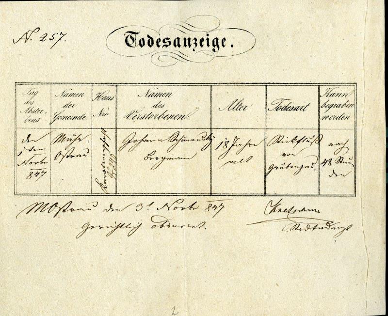 Úmrtní list horníka Jana Schimanského, který zemřel 1. 11. 1847 na dole Karolina při výbuchu důlního plynu.