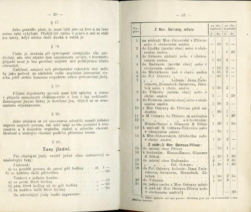 Ukázka z Jízdního řádu pro osobní dopravu vozmo v obcích Moravské Ostravě a Přívoze, který schválil obecní výbor v Moravské Ostravě 3. 11. 1890.