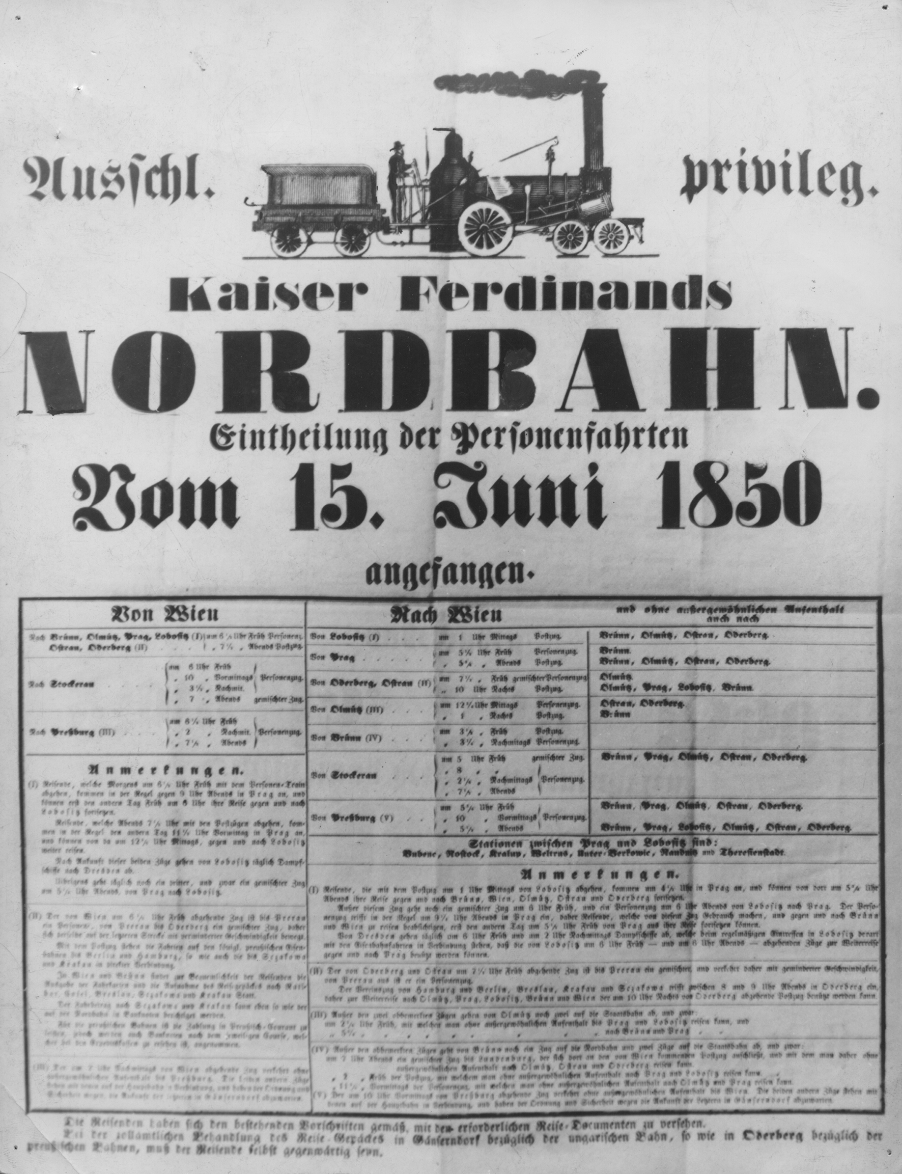 udělil privilegium na dobu padesáti let s tím, že dráha bude včetně odbočných tratí na Brno, Olomouc a Opavu dostavěna do deseti let. Trať byla předávána do provozu po jednotlivých úsecích. První osobní vlak vyjel 6. ledna 1838 z Vídně do Wagramu. Finanční komplikace stavbu dráhy na čas zastavily. Naštěstí se podařilo získat souhlas s prodloužením termínu dokončení o dalších deset let. V r. 1847 dospěla stavba do Bohumína. Závěrečný úsek z Bohumína do Osvětimi a Bílska včetně odbočky ze Svinova do Opavy se podařilo dokončit přesně v termínu – v březnu 1856.