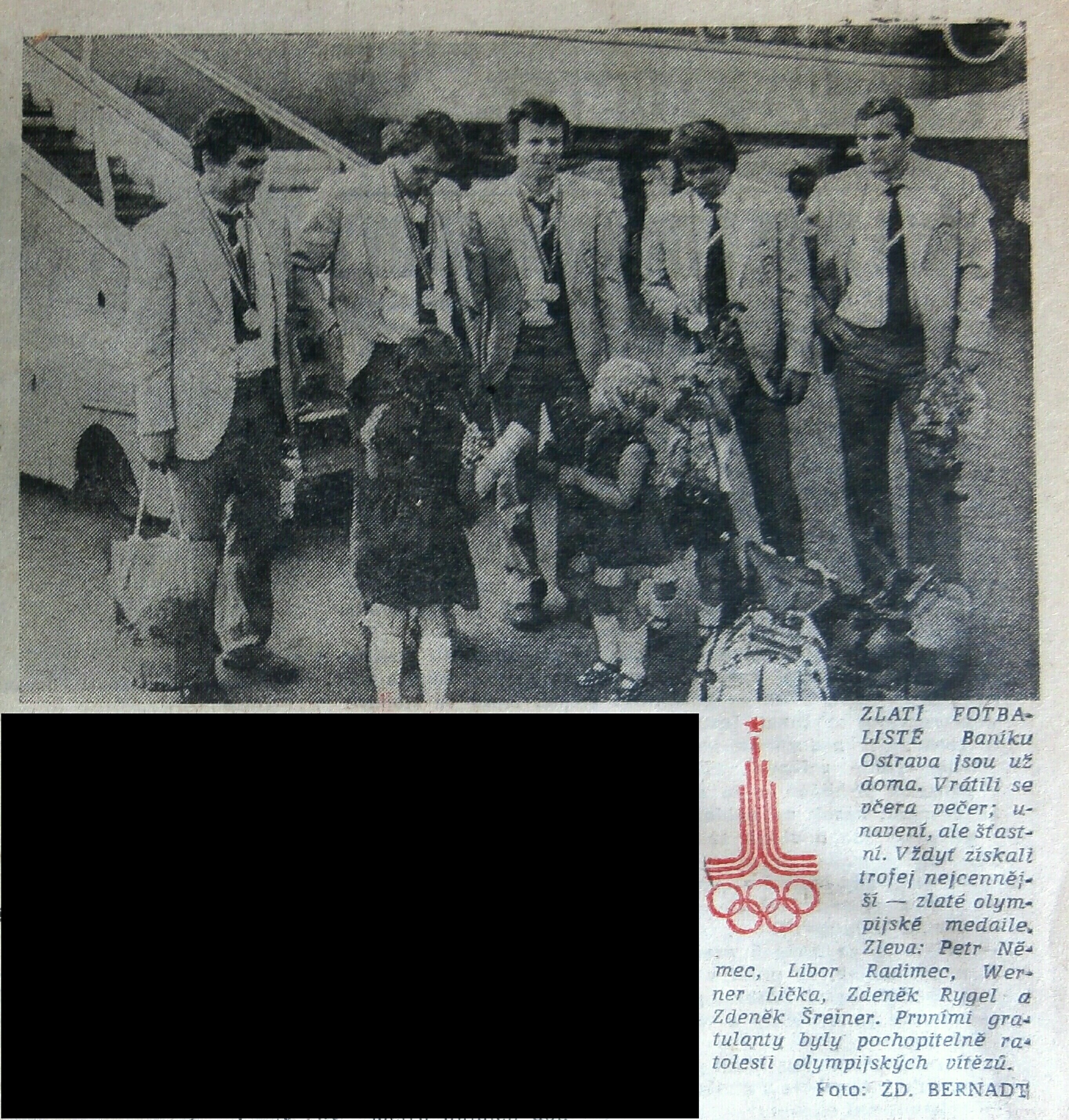 1) Zpráva v Ostravském večerníku o příletu fotbalistů Baníku Ostrava, kteří byli členy vítězného týmu na olympijském fotbalovém turnaji v Moskvě, na letiště v Mošnově 4. 8. 1980.