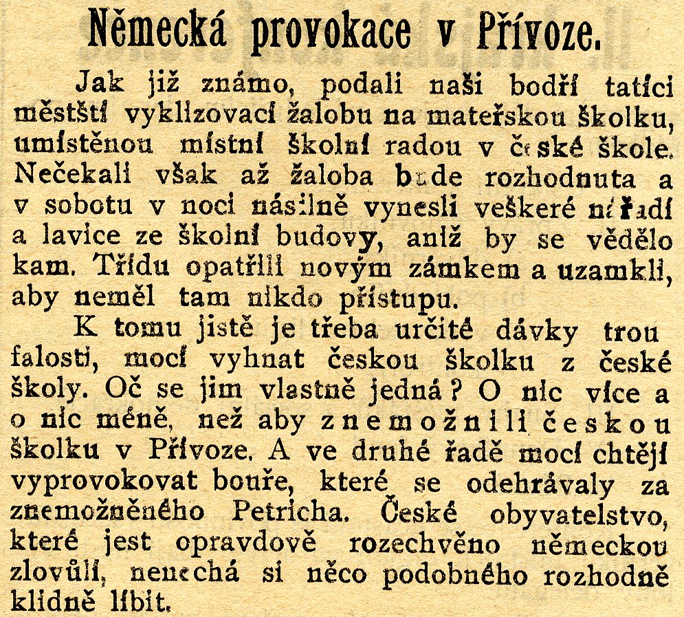 Ostravský noviny Duch času informovaly 28. října 1908 o zabrání české mateřské školky v Přívoze.