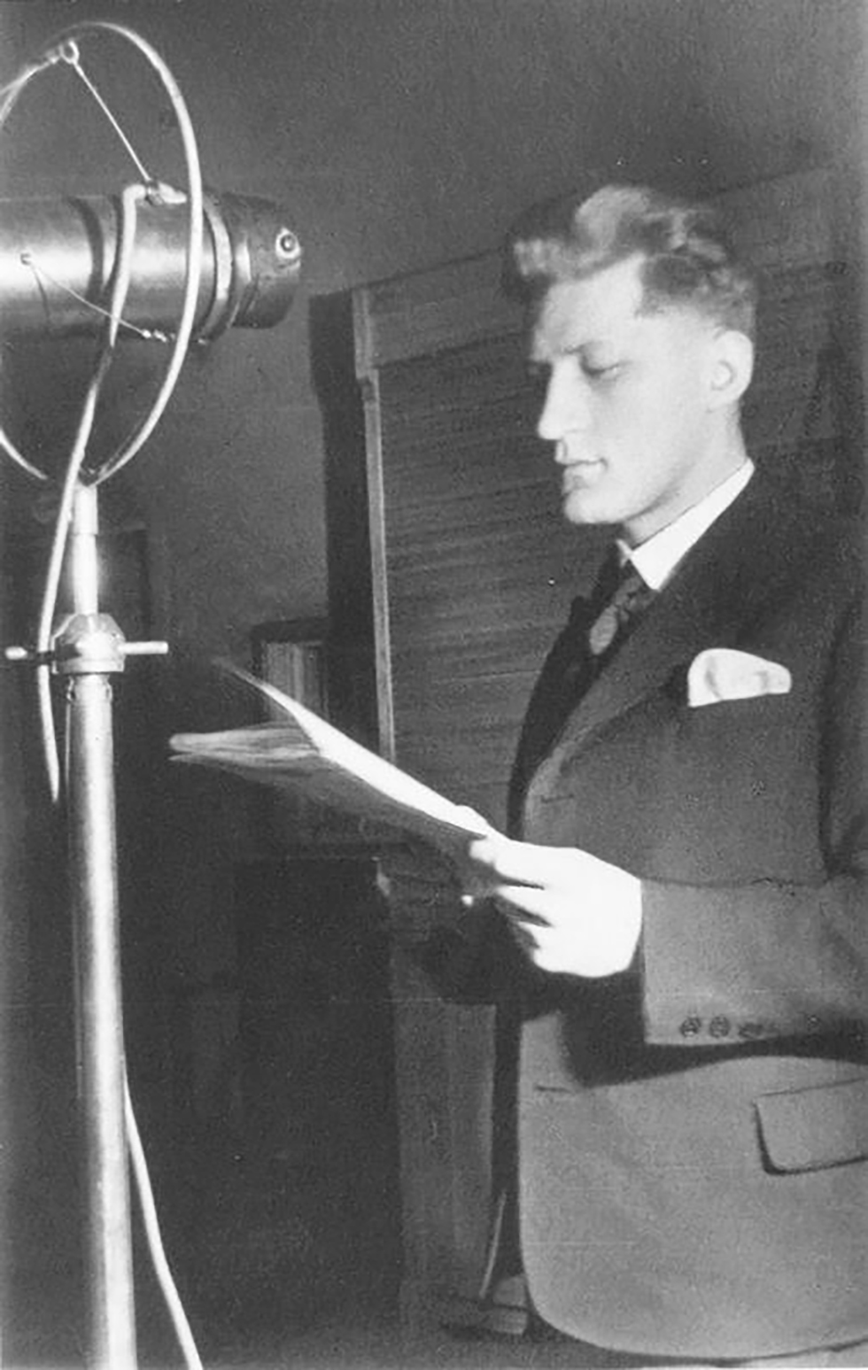 Foto: Milan Rusinský před rozhlasovým mikrofonem.