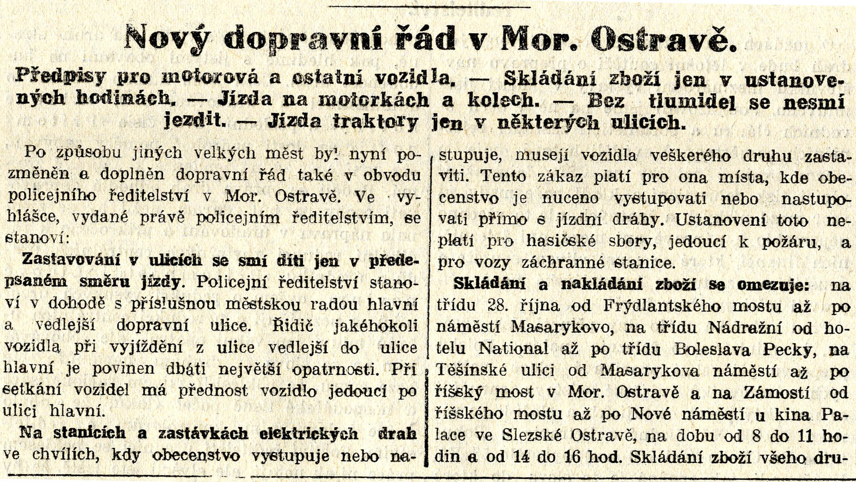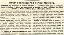 Noviny Duch času přinesl 26. března 1931 informaci o zavedení nového dopravního řádu (doplněk jízdního a uličního řádu) pro Moravskou Ostravu. Dosavadní dopravní řád byl po vzoru jiných velkoměst upraven a doplněn zejména v oblasti předpisů pro motorová a ostatní vozidla, dopravní obsluhu (skládání a nakládání zboží), provoz elektrických drah. Obsáhlý článek seznamuje čtenáře v závěru rovněž s výší trestů za případné přestupky proti těmto předpisům a podotýká, že jejich platnost začne dnem 5. 4. 1931.