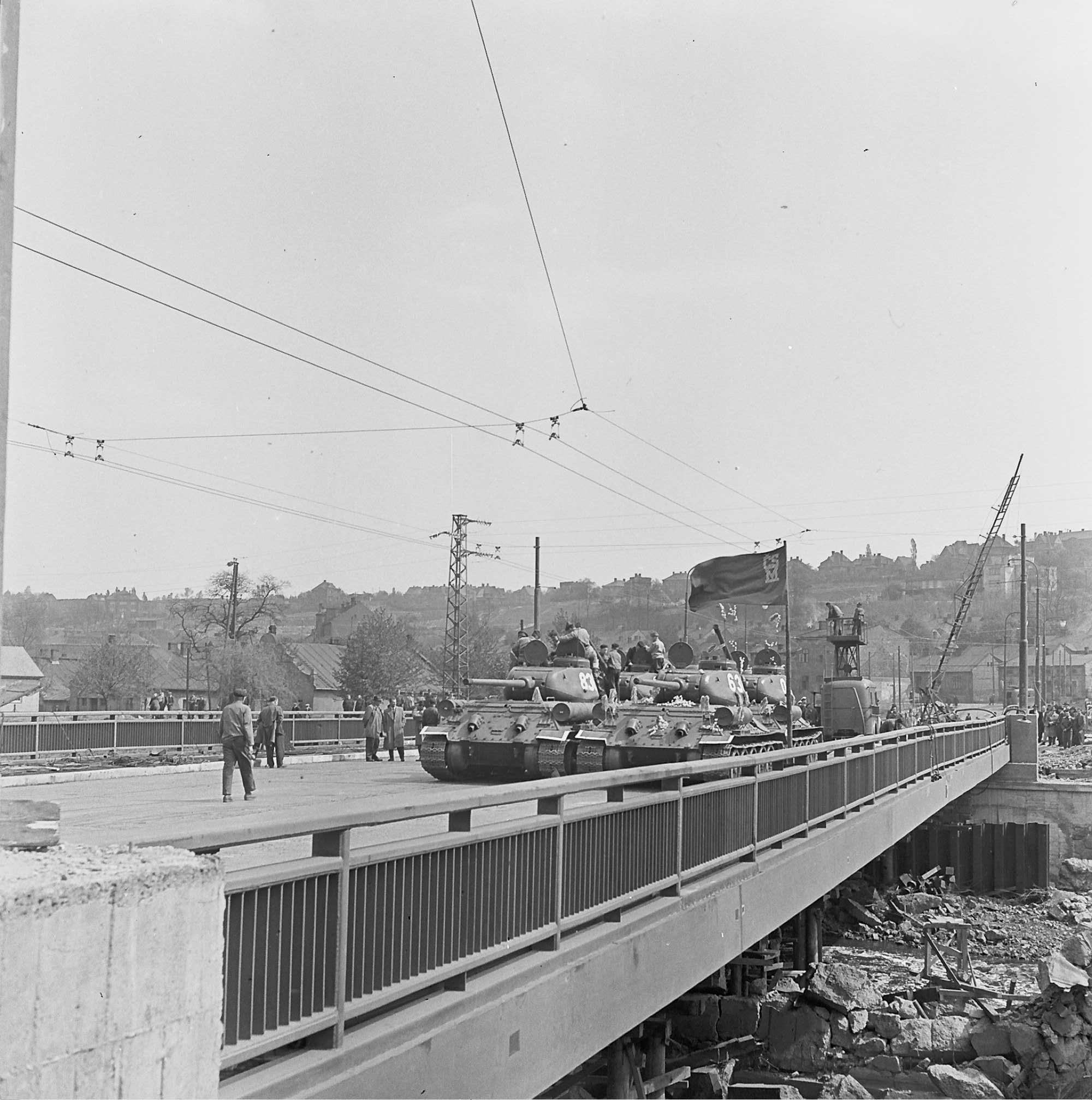 Zatěžkávací zkouška mostu Pionýrů krátce před jeho zprovozněním v roce 1959. V této podobě most fungoval do listopadu 1976, kdy byl poškozen výbuchem koksárenského plynu.