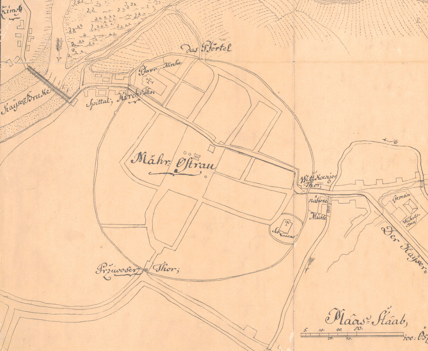 Městské hradby s branami na plánku města Moravské Ostravy k r. 1779.