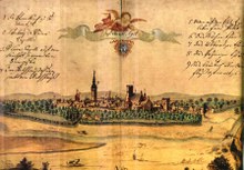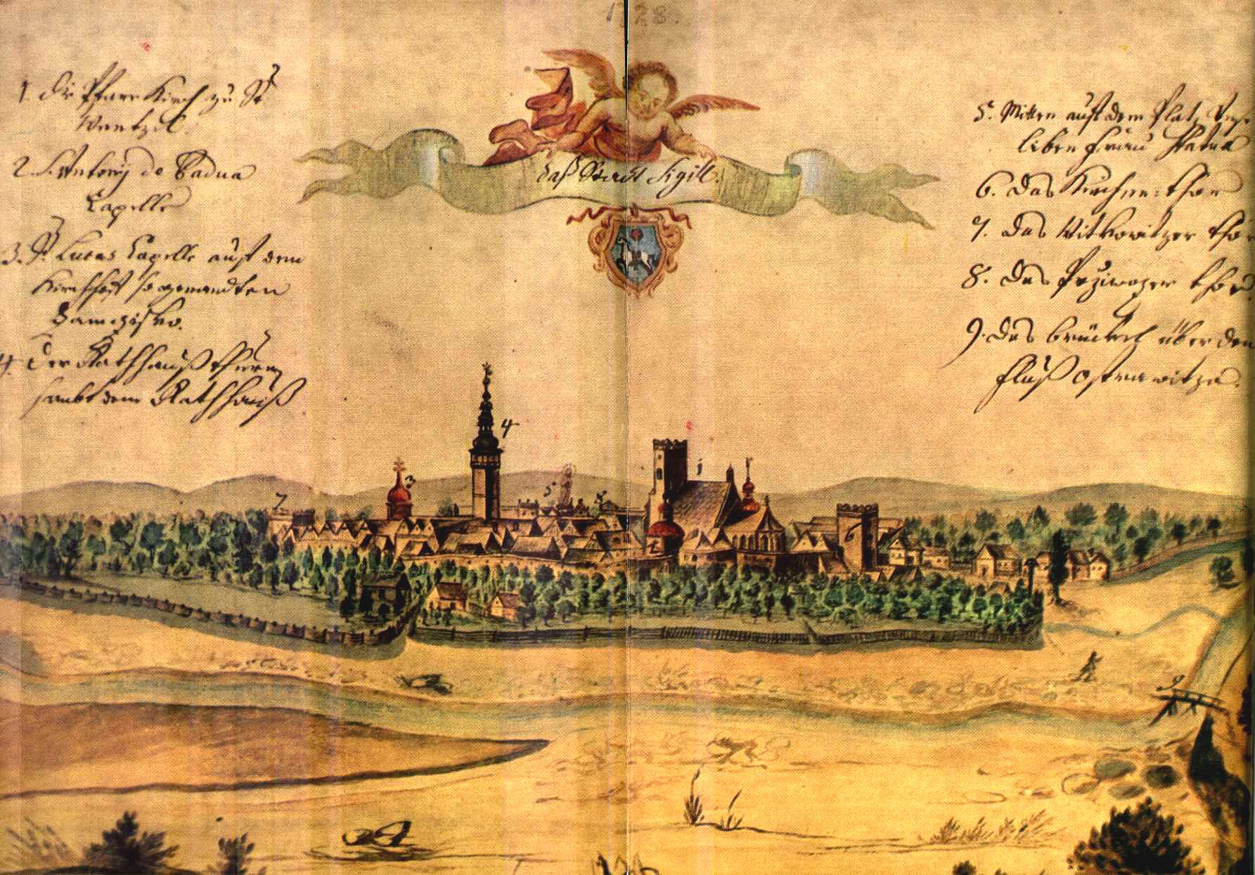 Veduta z r. 1728. Věž Hrabovské brány je zobrazena na vedutě pod číslem 7.