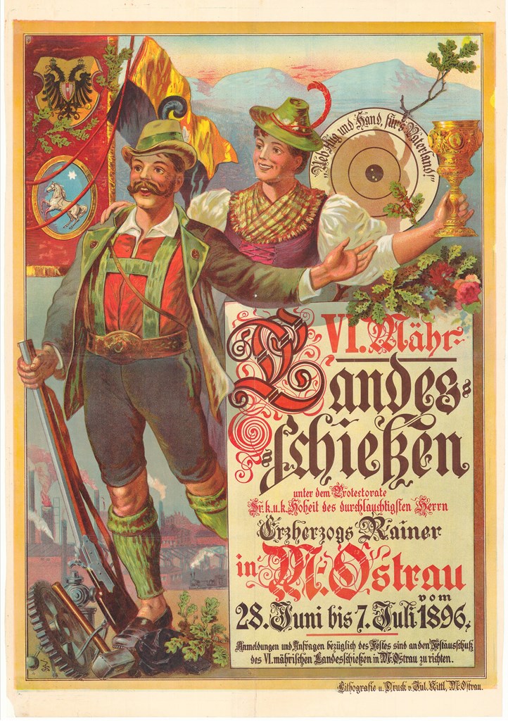 2. Plakát na VI. moravské zemské střelby pořádané od 28. června do 7. července 1896 v Moravské Ostravě pod patronátem arcivévody Rainera. Zemské střelby byly nákladnou záležitostí, kterou mohl uspořádat jen finančně silný a organizačně schopný střelecký spolek mající k dispozici moderně vybavenou střelnici.
