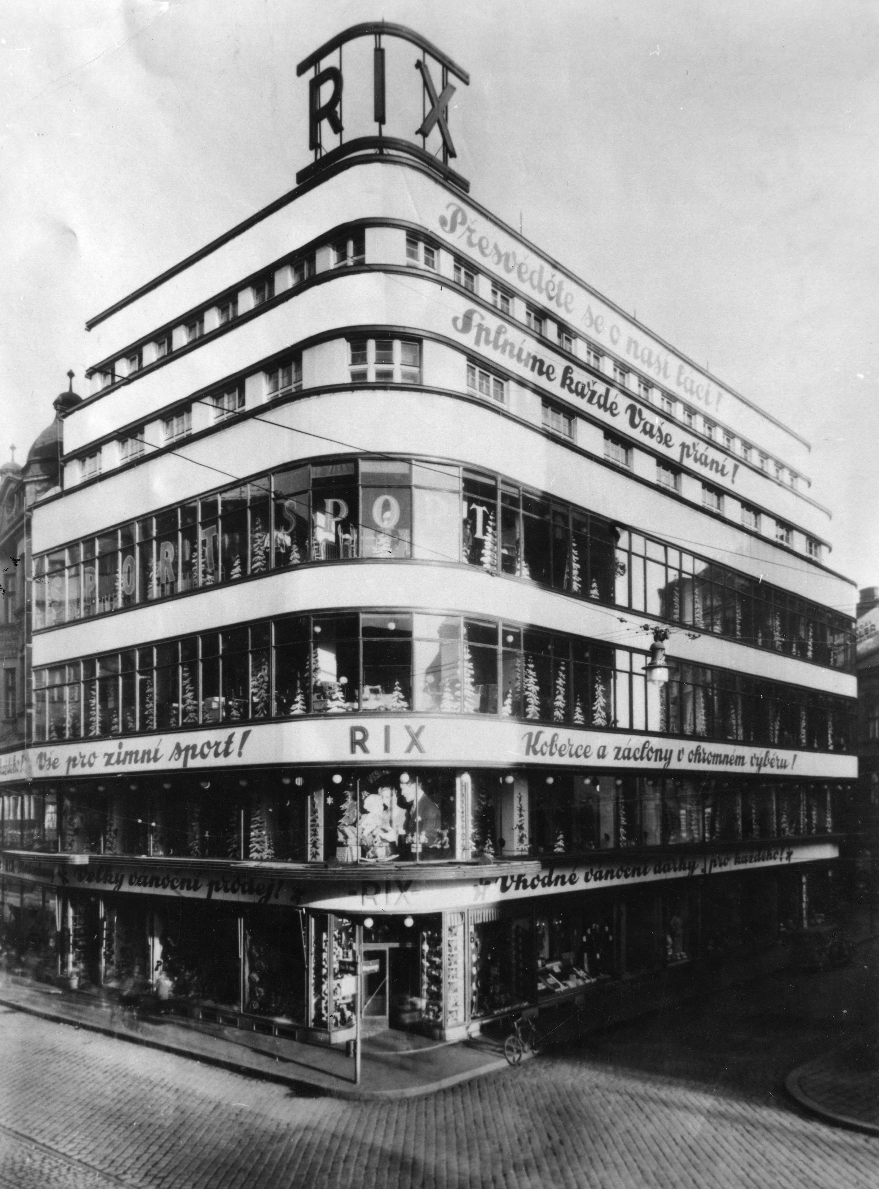 1) Obchodní dům Rix, nároží třídy 28. října a dnešní Vojanovy ulice, 30. léta 20. století. Budova byla válečnými událostmi značně poškozena a v r. 1947 demolována.