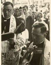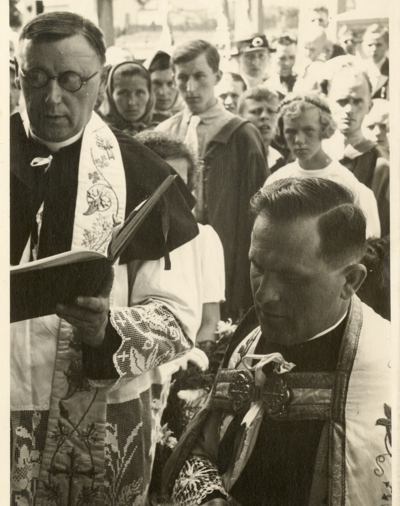 P. František Hadamčík ( 1894–1962), druhý farář ve Svinově (v popředí, vlevo) spolu s děkanem a porubským farářem Aloisem Gecem, 1937